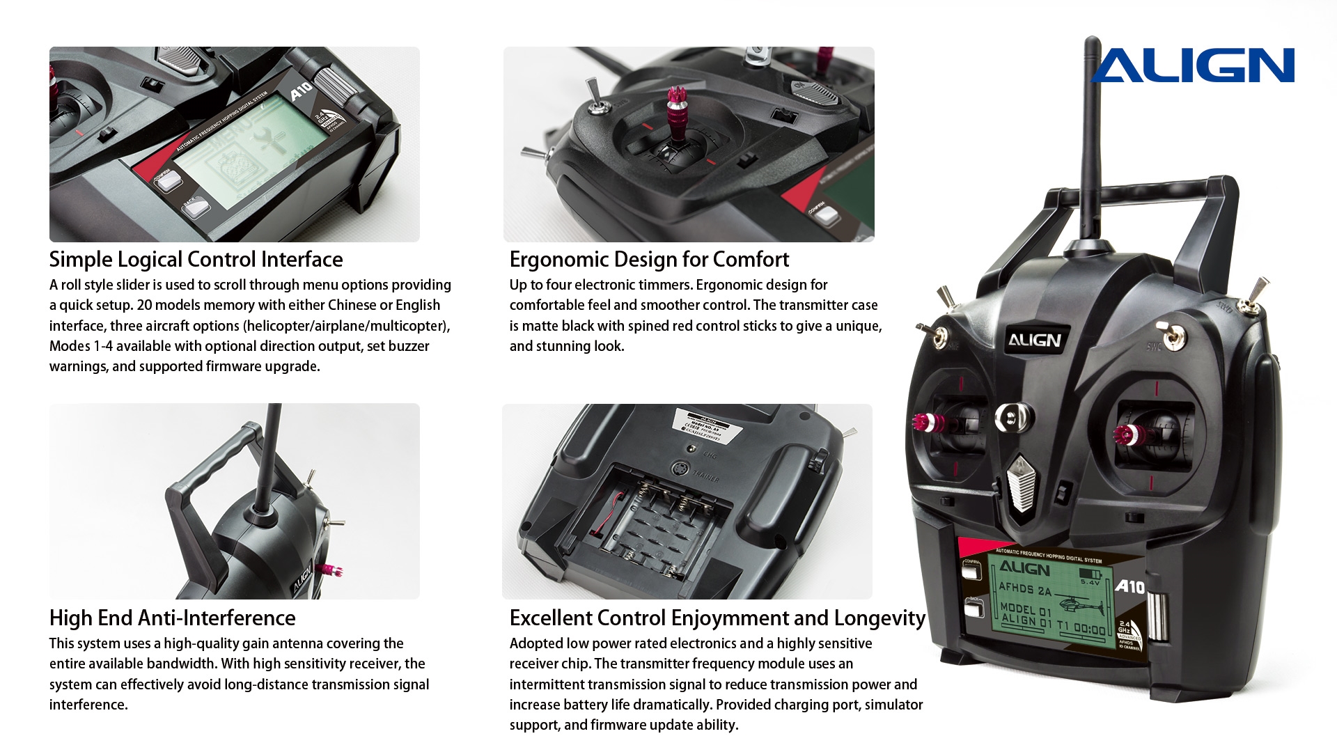 ALIGN A10 is AFHDS (Automatic Frequency Hopping Digital System) 2.4GHz transmitter provided with 10 channels. The stick and holder are designed based on ergonomic bringing much smoother control. Completed function with the mode of helicopter / aircraft / multicopter. Logical and simple control interface, and easy to set up.