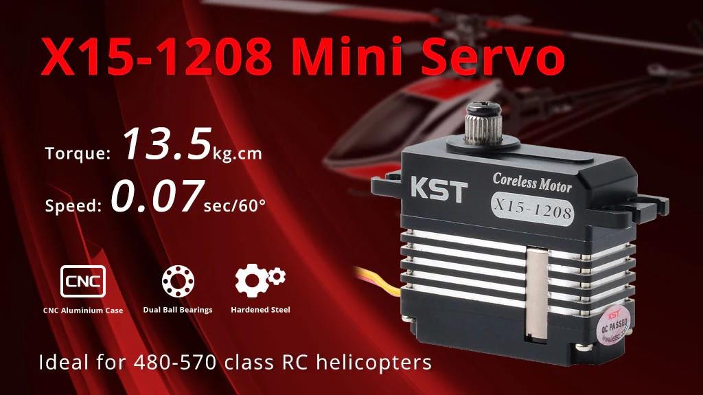 KST X15-1208 Mini Size Digital Servo is a great choice for helicopters ranging from 430mm-570mm rotor blade size requiring mini servos such as the Align T-Rex 500, Mikado Logo 480, MSH Protos 500, and SAB Goblin 570. Additionally these servos can be used in other RC applications where the physical dimensions, and torque/speed ratings suit the need of the RC application.